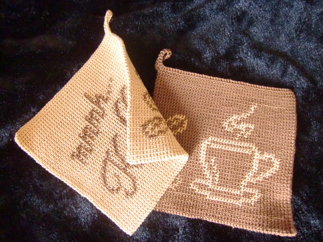 Das besondere an diesen Topflappen ist, dass man zwei komplett unterschiedliche Seiten für einen Topflappen gestalten kann. Durch die Technik werden die Topflappen auch schön dick und somit hervorragend isolierend. Gleichzeitig spart man sich – bis auf den Abschluss - das Vernähen der Fäden, da diese direkt in den Topflappen eingearbeitet werden.