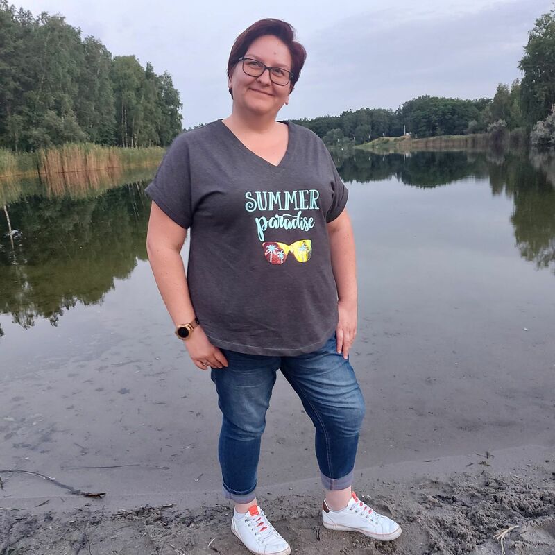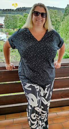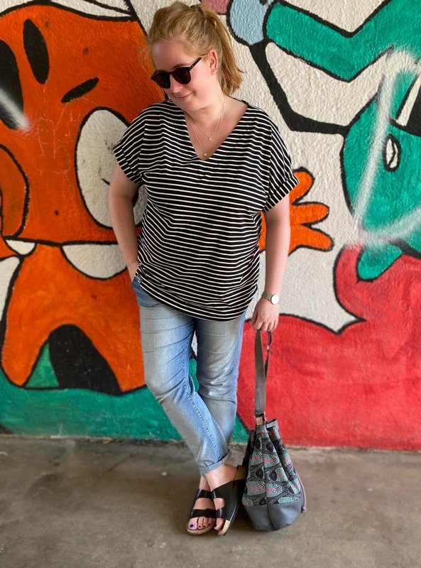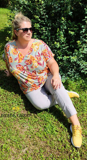 Das Basic Shirt mit Ärmelaufschlag ist ab sofort auch in den Größen 46-56 (max. Brustumfang ca. 140 cm) erhältlich. Es ist ein schlichtes und schnell genähtes Shirt mit kleinen, separat angenähten Ärmelaufschlägen und V-Ausschnitt mit Besatz und kann auch von Anfängern mit geringen Vorkenntnissen gut umgesetzt werden. Die Passform ist leger und locker, so bietet es auch bei steigenden Temperaturen einen angenehmen Tragekomfort und ausreichend Bewegungsfreiheit. Du kannst das Shirt zu verschiedenen Styles kombinieren, je nach Stoffwahl sportlich oder auch elegant. In der Anleitung zeig ich dir, wie du im Nu ein lässiges Shirtkleid aus dem Schnitt zauberst. Rückenlänge 61-66 cm