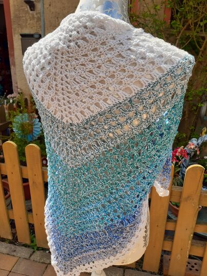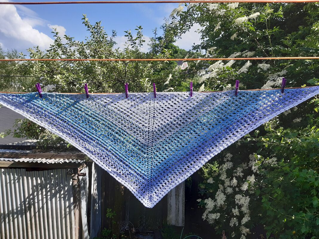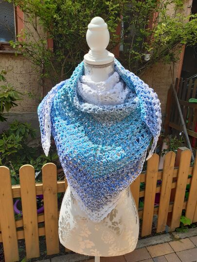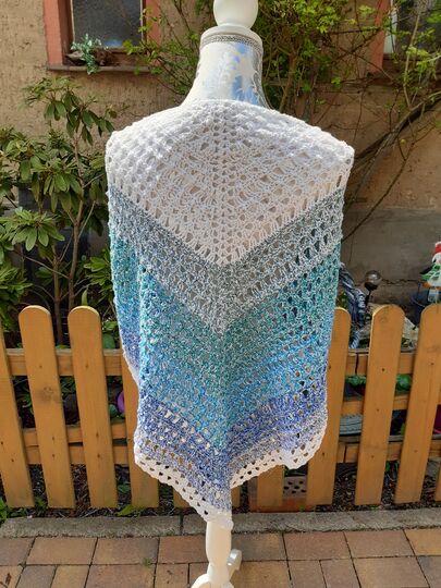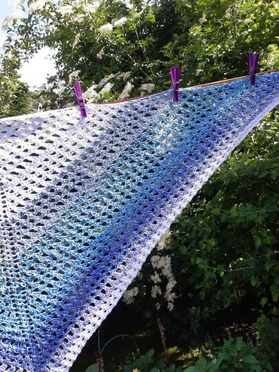 Ich habe hierfür einen Bobbel von 1000m verwendet. Dabei ergibt sich eine Größe des Tuches von ca. 80cm (Spitze zur Mitte) x 180cm (von Spitze zu Spitze)