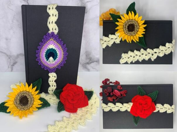 Mit dieser Anleitung kannst du 4 verschiedene Lesezeichen häkeln, zwei Pfauenfedern, eine Rose und eine Sonnenblume. Die Lesezeichen können als gewöhnliche Lesezeichen in der Mitte des Buchs verwendet werden, oder dekorativ an der Vorderseite mit einem Knopf geschlossen werden, wodurch ein Verrutschen des Lesezeichens verhindert wird, und das Lesezeichen dekorativ präsentiert werden kann.