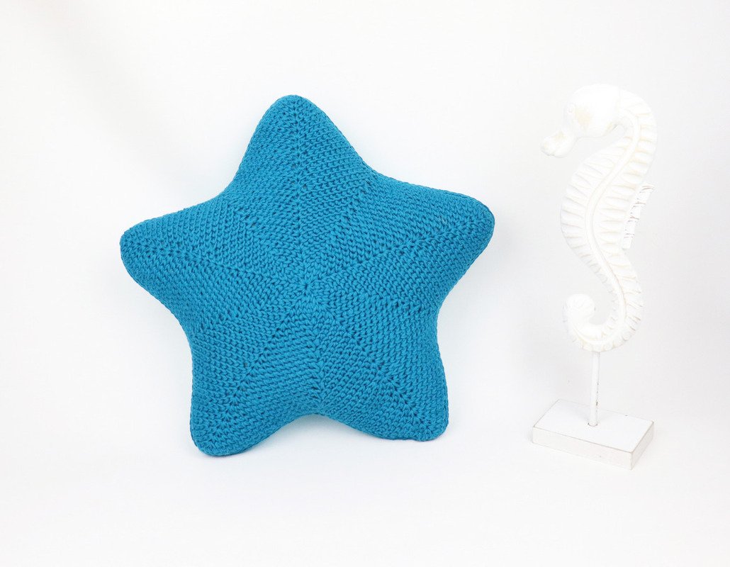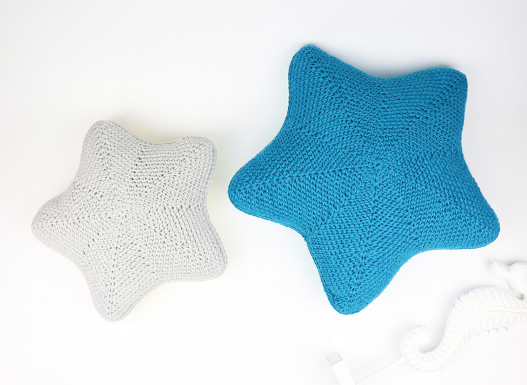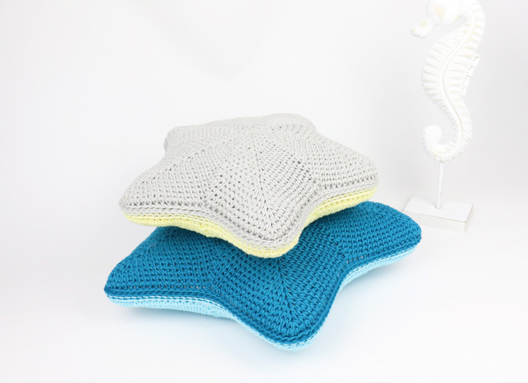 Die zwei Kissen können in zwei Größen gehäkelt werden. Kleines Kissen mit dem Durchmesser ca. 31 cm oder großes Kissen mit dem Durchmesser ca. 42 cm. Verwöhnen Sie sich und Ihre Familie mit weichen Kissen in der Sternenform!