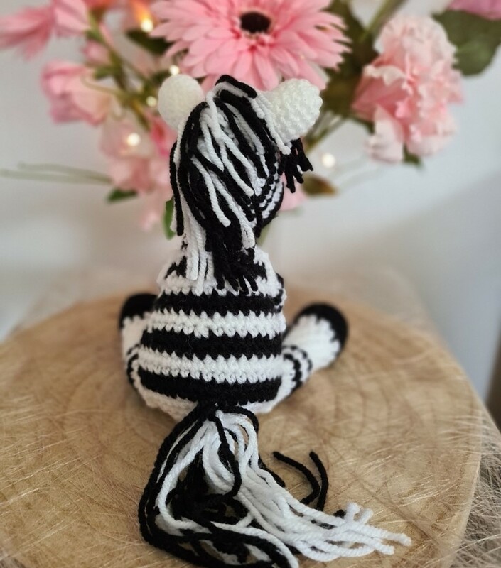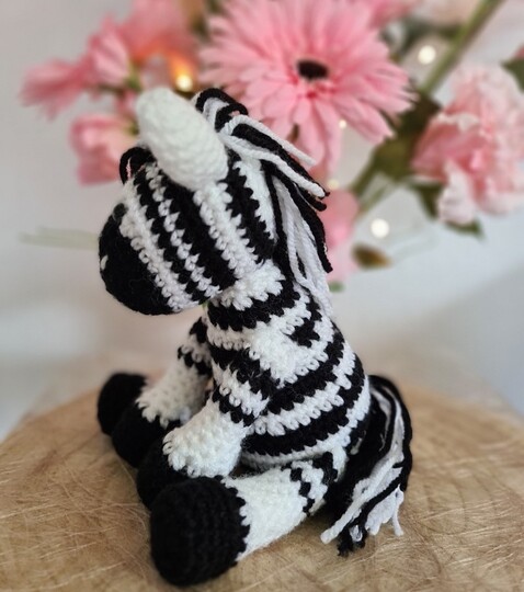 Mit der Lisa Premium Wolle und einer 5.0 Häkelnadel misst das Zebra sitzend eine Größe von ca.13,5 cm Höhe.