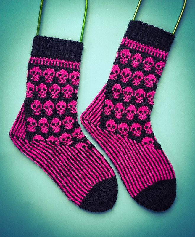 Eine anspruchsvolle Colourwork-Socke in Neonfarbend die das Thema des mexikanischen Totenfestes "Dia des los Muertos" aufgreift. Nicht nur Teenies können sich hierfür begeistern.