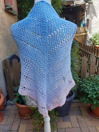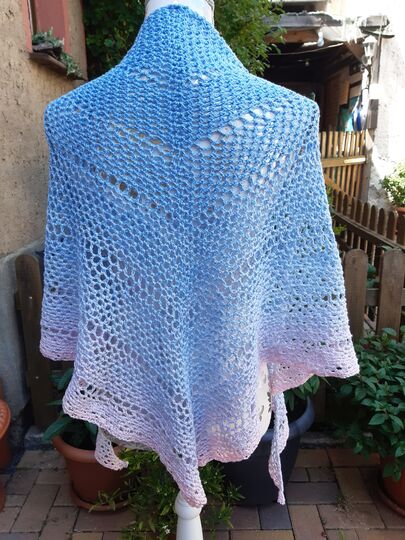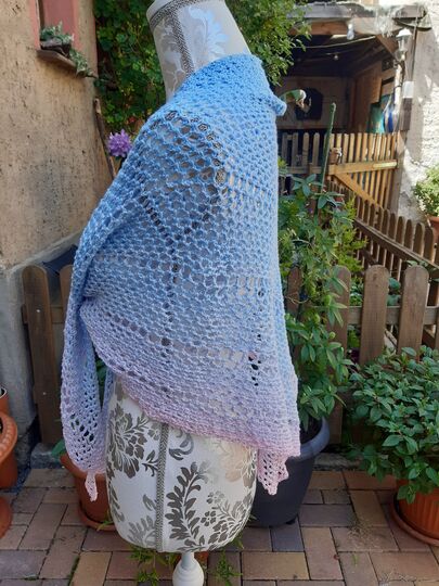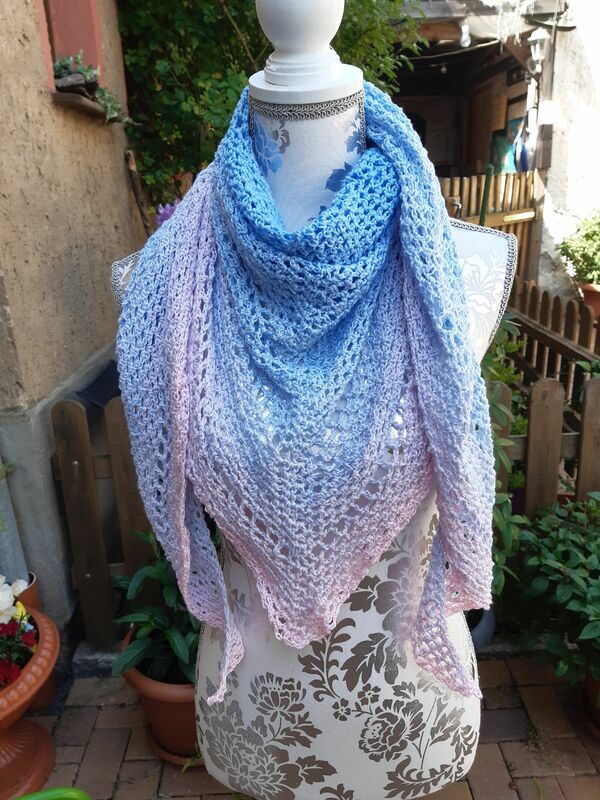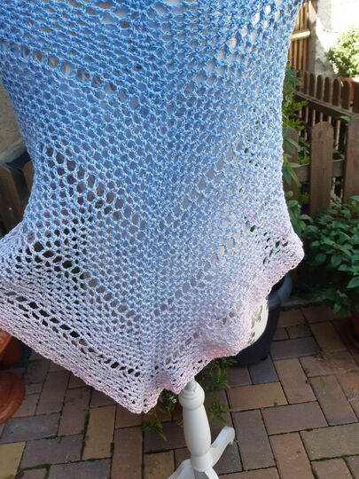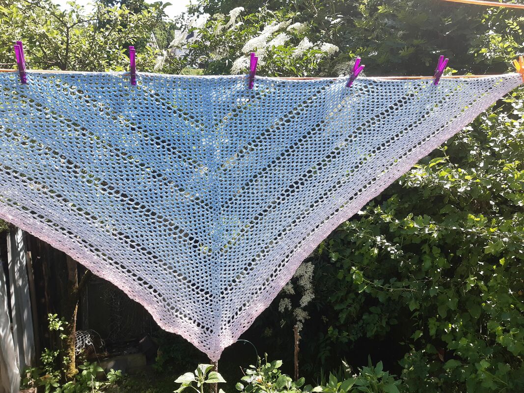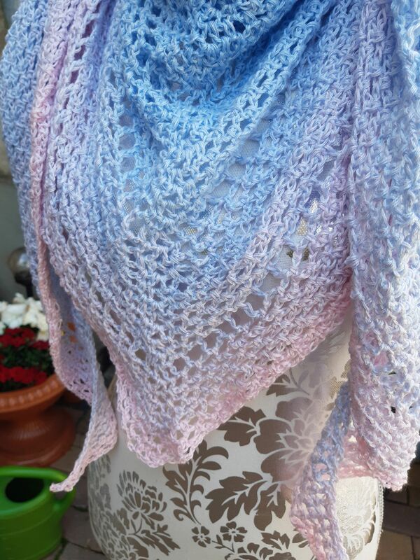 Ich habe hierfür einen Bobbel von 800m verwendet. Dabei ergibt sich eine Größe des Tuches von ca. 95cm (Spitze zur Mitte) x 195cm (von Spitze zu Spitze)