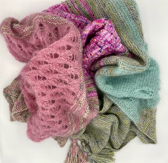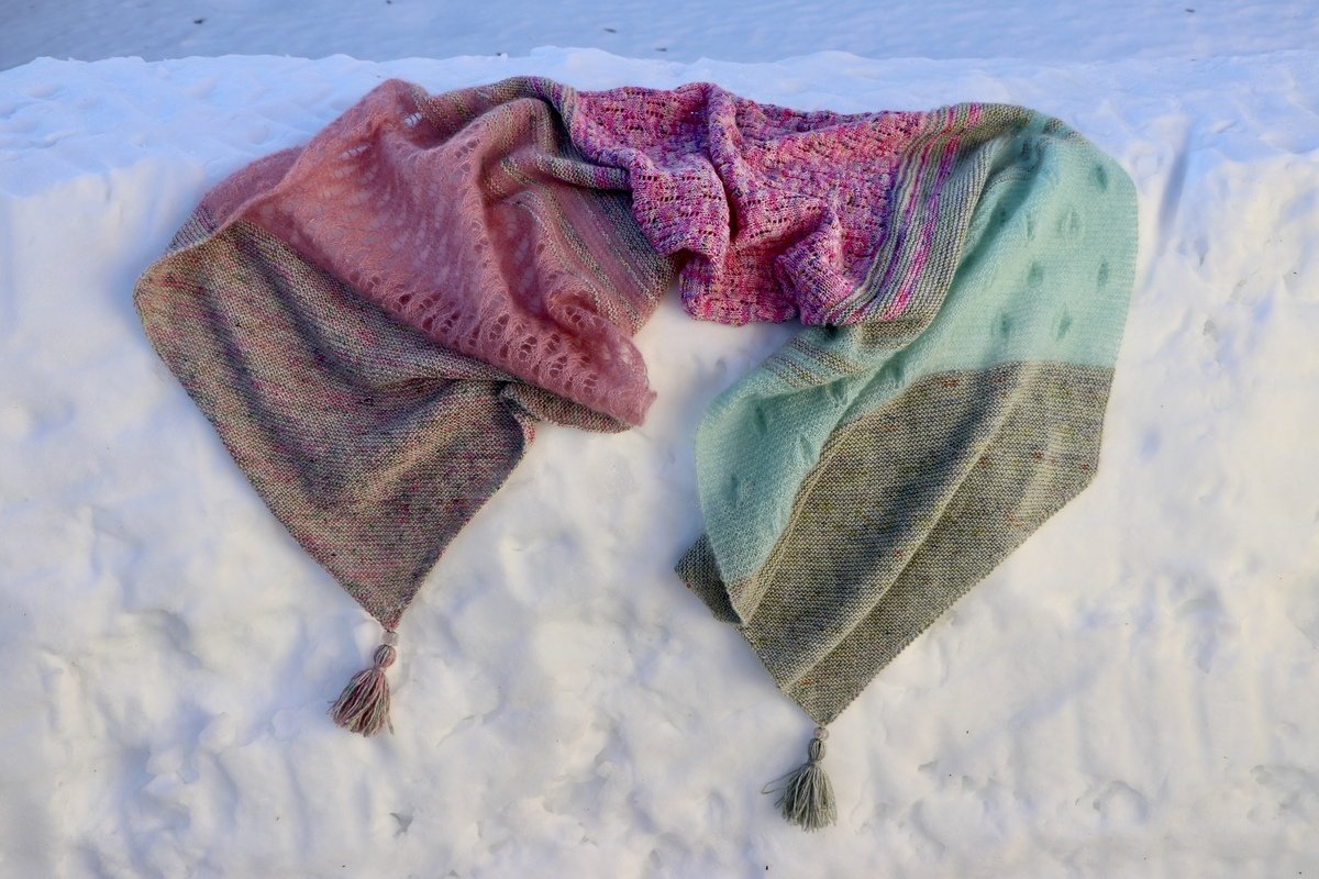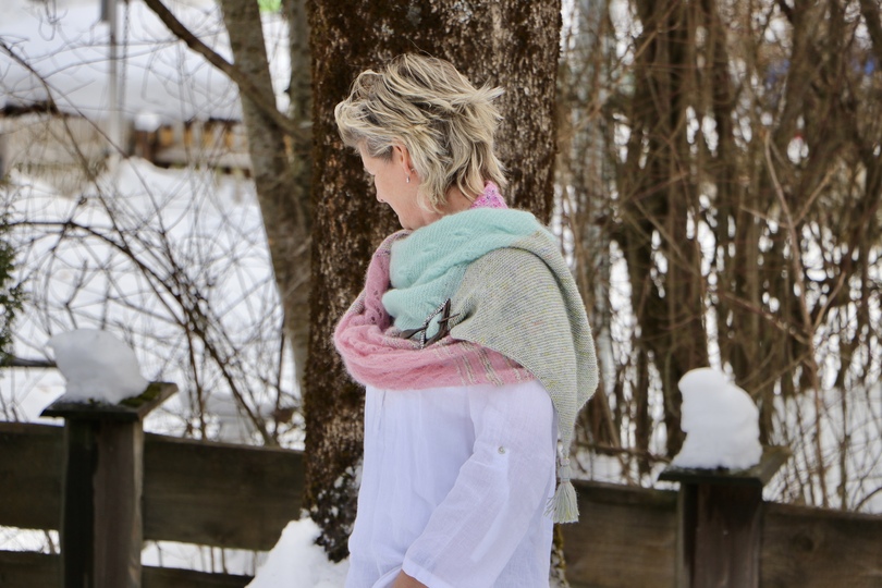 Highland Heather ist für mich genau diese Mischung: ein bisschen grün für die Täler, ein bisschen pink und rosa für die Heide und nicht zu vergessen die kleinen umherfliegenden Hummeln dargestellt durch ein spezielles Loch-Muster. Die Vielfalt der schottischen Landschaft symbolisiert durch verschiedene Wollqualitäten und Muster. Das Stricken dieses Schals war für mich wieder eine kleine Reise in die Natur und Schönheit Schottlands.
