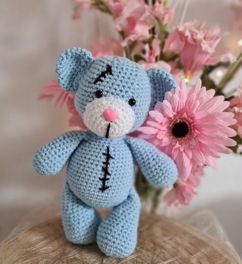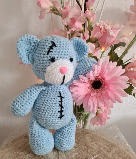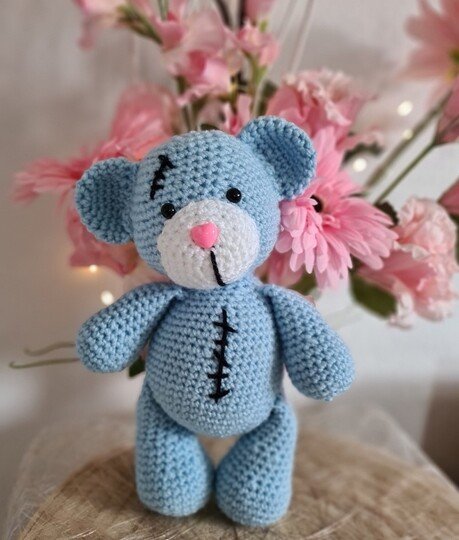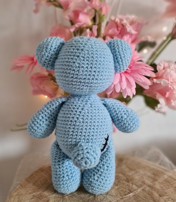 Mit der Lisa Premium Wolle und einer 5.0 Häkelnadel misst der Teddybär eine Größe von ca. 23 cm Höhe.