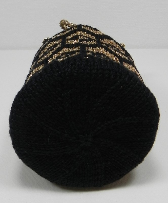 Dazu wurden bis zu 2 Knäuel Strickgarne (1 Knäuel Schwarz und 1 Knäuel Gold) verwendet, bestehend aus einem Knäuel aus 100 % mercerisierter Baumwolle (Farbe Schwarz) und einem Knäuel aus einer Polyester-Polyamid-Mischung (Farbe Gold).