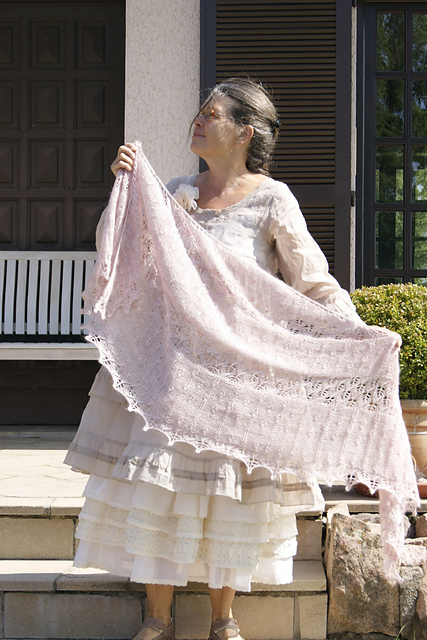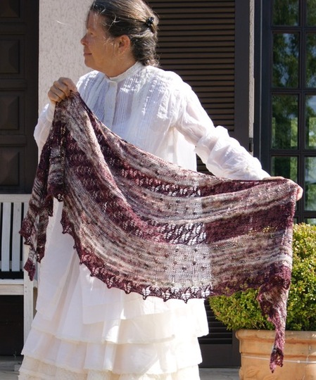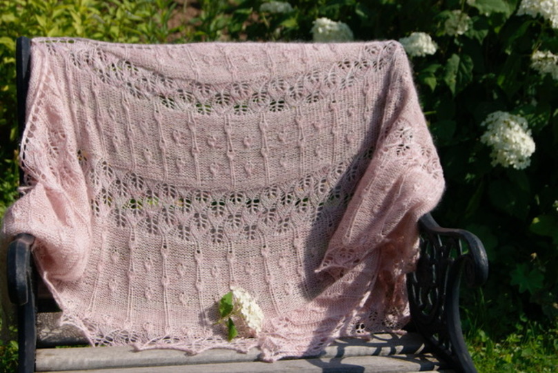 Lacegarn mit einer LL von 750 - 800 m, um das Tuch einfarbig zu stricken. Nach Wunsch kann der glatt links Teil zusammen mit einem Mohair Beilauffaden gestrickt werden (siehe Foto)