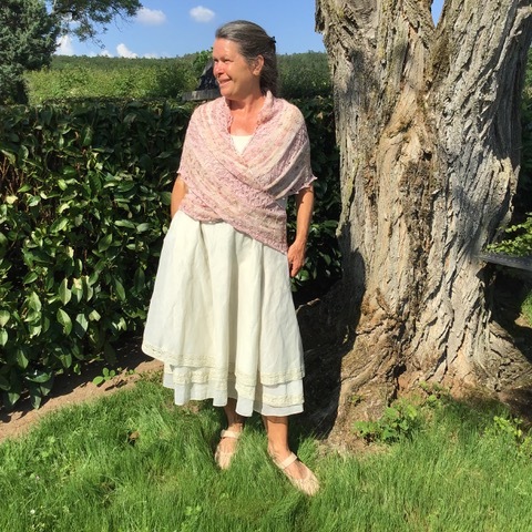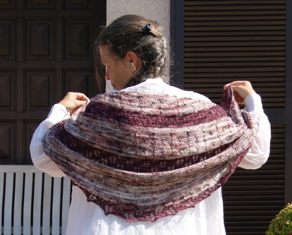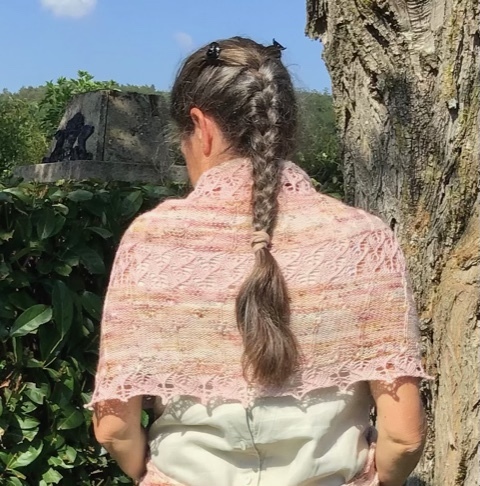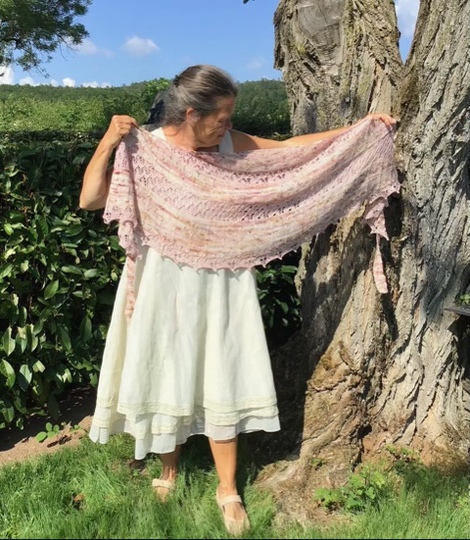 Das Rosenkuss Tuch wird in Crescent Form mit zwei kontrastierenden, aber zugleich harmonierenden Farben gestrickt. Ich empfehle den Lace Teil in Uni Garn zu arbeiten und für den glatt links Teil ein meliertes Garn zu wählen. Um die Bogenform zu „vertiefen“, können nach dem 2. und 3. glatt links Teil ein paar verkürzte Reihen gestrickt werden, der Garnverbrauch erhöht sich dabei aber erheblich und es sollten mindestens 550 m der HF vorhanden sind.