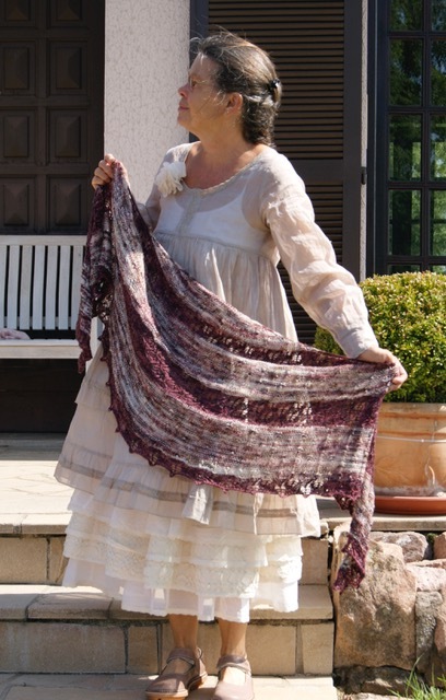 Nach Wunsch kann im Nachhinein das Tuch mit zwei „Bändern“ zum romantischen Tragen „über Kreuz“ ausgestattet werden. Statt zweifarbig, kann das Tuch auch in einem Lace - Mohair Gemisch gearbeitet werden.