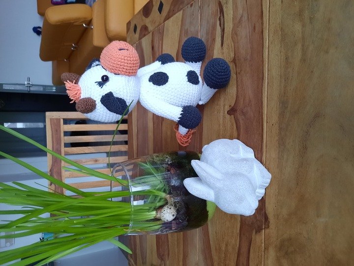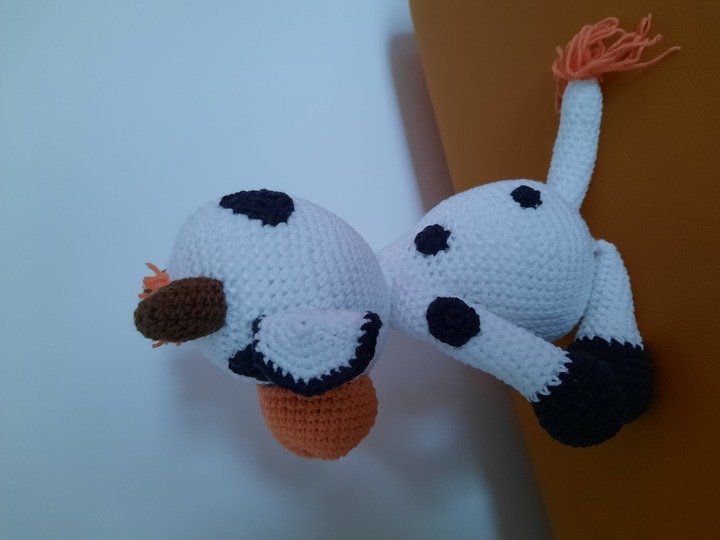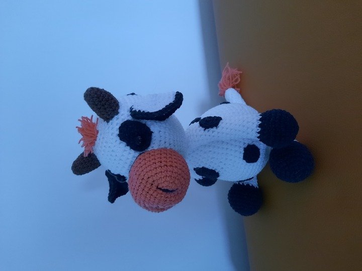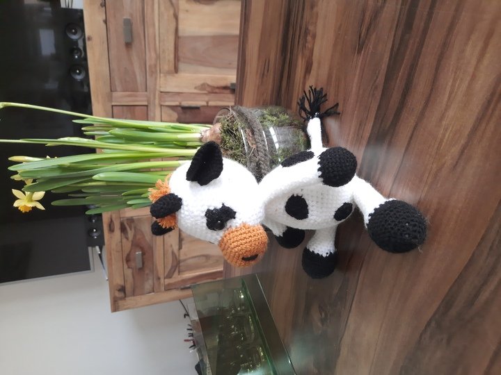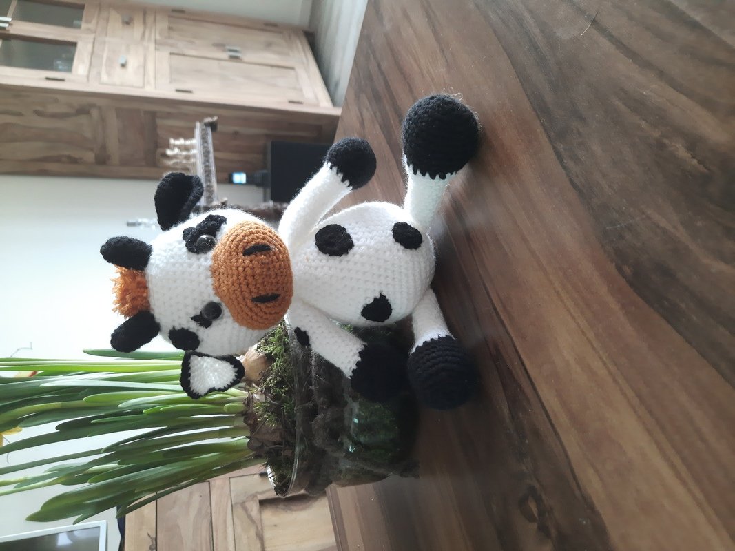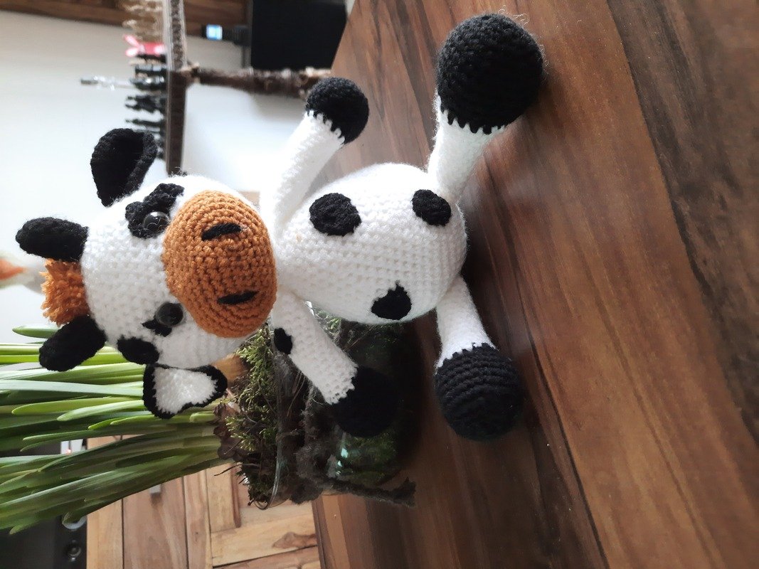 Die Kuh ist ca. 25 cm groß. Dies kann aber je nach Garn-, und Nadelstärke varrieren.