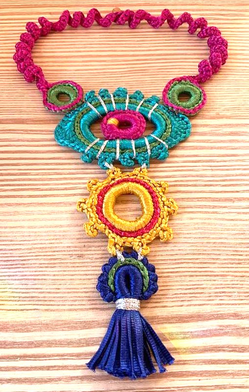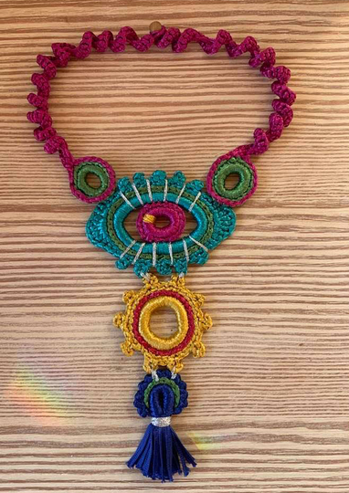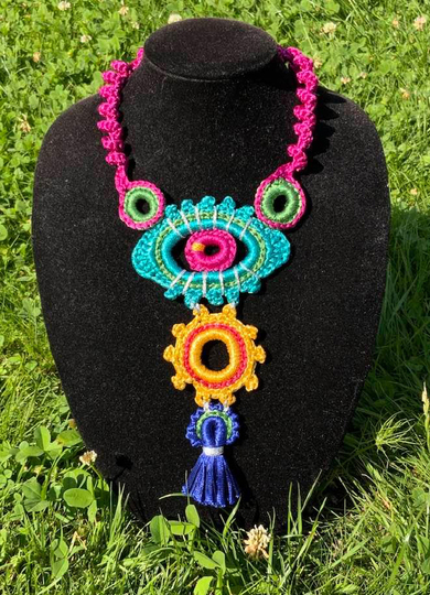 Das fertige Collier .... also die Schmuckplatte vorne ist 22 cm lang und 10 cm breit..und wiegt 24 gr..die Kette selber kannst Du ja auch länger häkeln...
