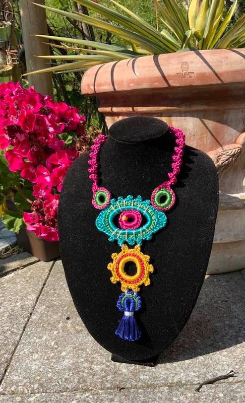 Das farbenfrohe Collier "Das Magische Auge" ist ein wundervoller Sommerschmuck ...aber auch im Winter über einem dicken Pulli ein toller Farbklecks...