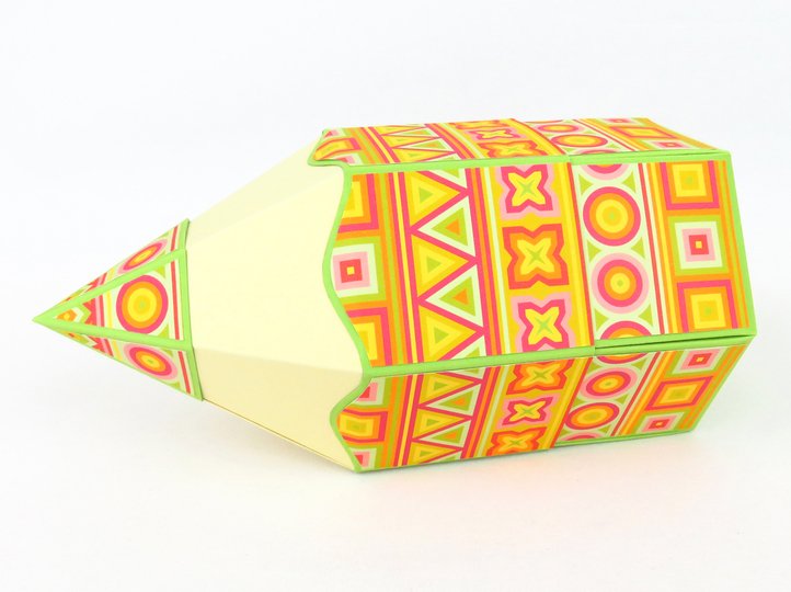 Diese Explosionsbox ist hauptsächlich für Süßigkeiten und andere sehr kleine Geschenke zu Einschulung gedacht, wie Radiergummis, Bleistiftspitzer, Mini-Stifte u. Ä.. Neben der kleinen Süßigkeiten-Explosion sorgt sie für eine weitere Überraschung: Im oberen Teil des Stifts, also im Deckel, befindet sich ein Behälter für ein weiteres Geschenk. Das darf allerdings nicht zu schwer sein, damit der Behälter sich nicht von alleine öffnet. Ein kleines Kuscheltier vielleicht?