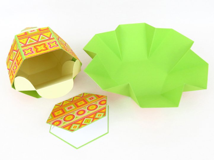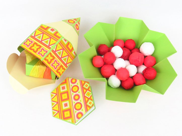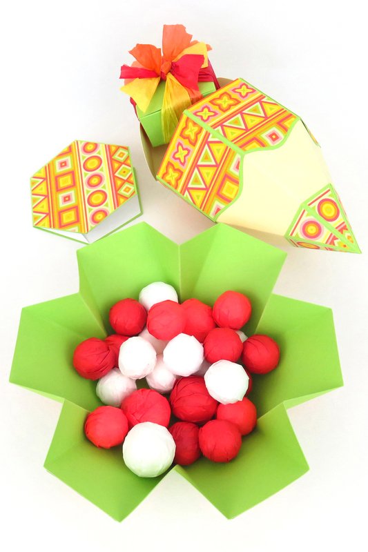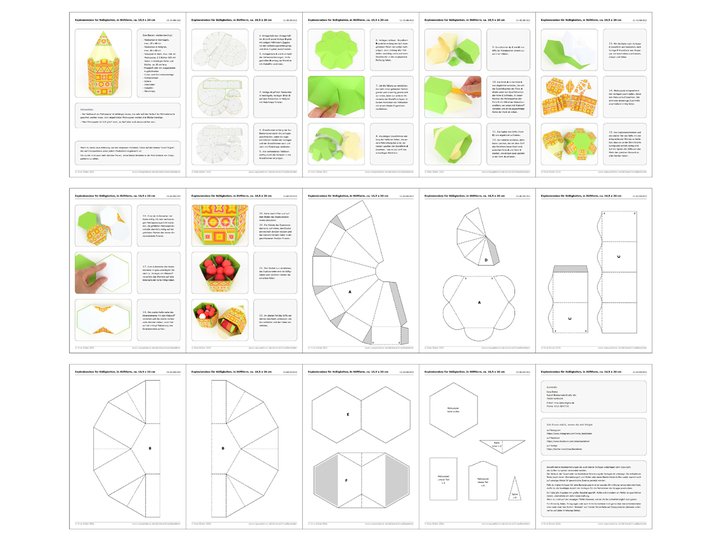Die kleine viereckige Schachtel, die auf manchen Fotos zu sehen ist, ist nur eine Deko und nicht der Gegenstand dieser Anleitung. Falls du kleine Schachteln benötigst, kannst du Vorlagen dafür hier herunterladen: