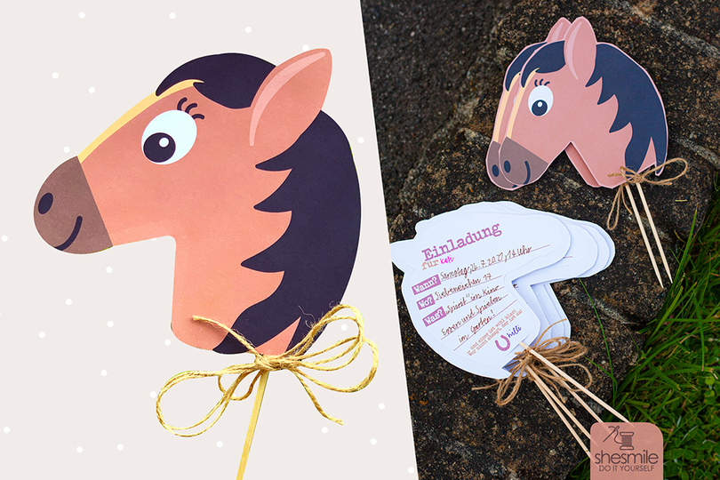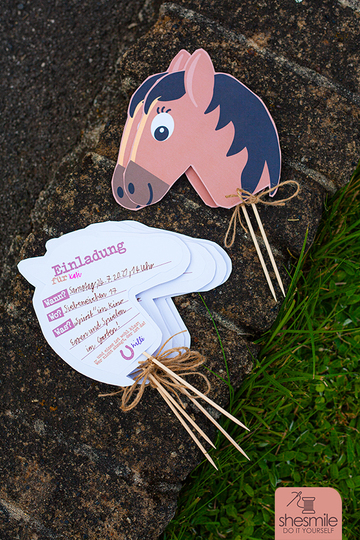 Die Einladungskarte aus Papier zum Selberbasteln für deine Pferdeparty. Zuhause im Garten oder auf dem Reiterhof.