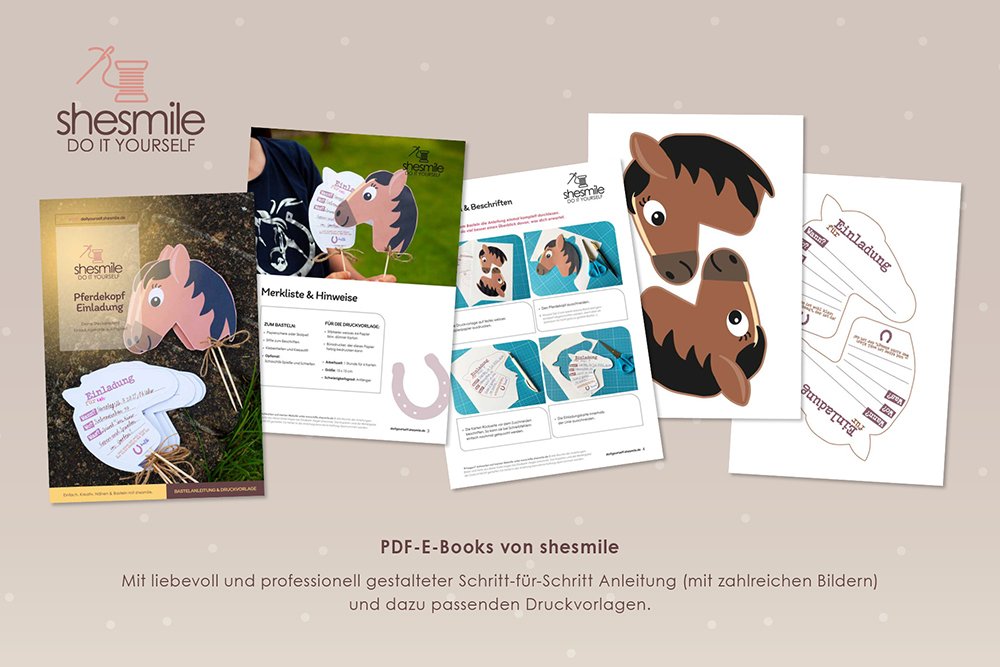 Bastelanleitung und Druckvorlagen gestaltet als PDF-E-Book für eine Pferdekopf bzw. Steckenpferd Einladungskarte aus Papier zum Selberbasteln.