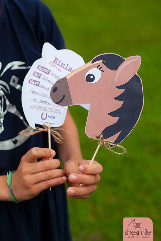 Mit einem Schaschlikspieß zwischen Pferdekopf und Einladungskarte wird daraus ein kleines Steckenpferd. Perfekt dazu passt eine Schleife.