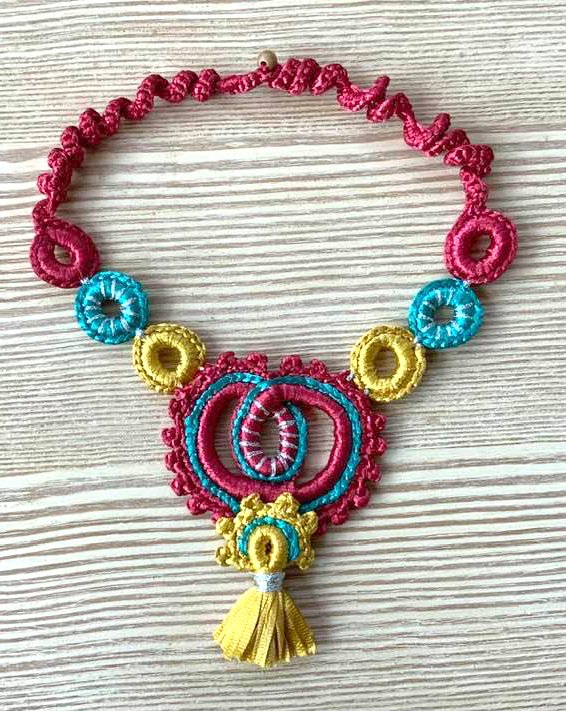 Das fertige Collier .... also die Schmuckplatte vorne ist 16 cm lang und 8 cm breit..und wiegt 24 gr..die Kette selber kannst Du ja auch länger häkeln...