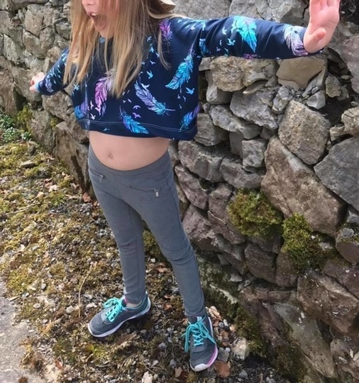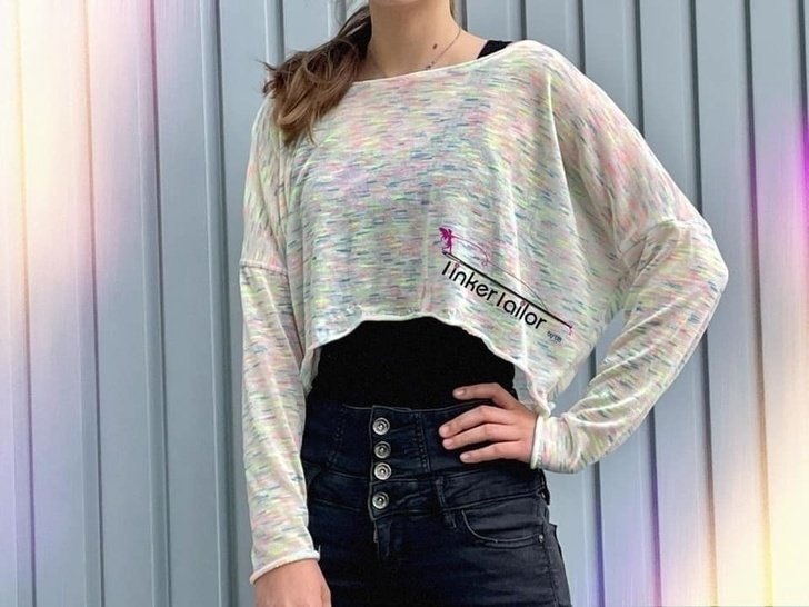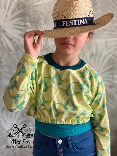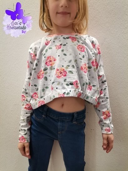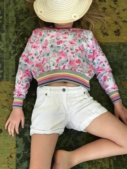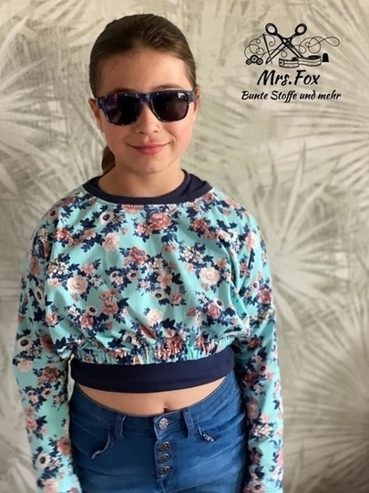 Das Mini-Cropped ist ein wirklich kurzes, weit geschnittenes Shirt, welches nach genauen Angaben meiner präpubertären Tochter entstanden ist. Das Shirt ist ultraknapp, dafür aber lässig weit. Die Ärmellänge ist auf 7/8 bemessen, so dass man sie auch lässig schoppen kann. Um die Länge oder eher Kürze ein kleines bisschen auszugleichen, gibt es ein passendes Kurztop zum drunter ziehen dazu. Dieses erreicht zumindest „Bauchnabellänge“ und ist eng anliegend, so dass nichts komplett frei liegen kann ;-) Das ebook „Croppi“ ist separat erhältlich. Die kleinen Mädels sind begeistert von der „bauchfrei“ Mode und mit ner coolen Highwaist oder Paperbaghose entsteht ganz schnell ein cooles Outfit :-)