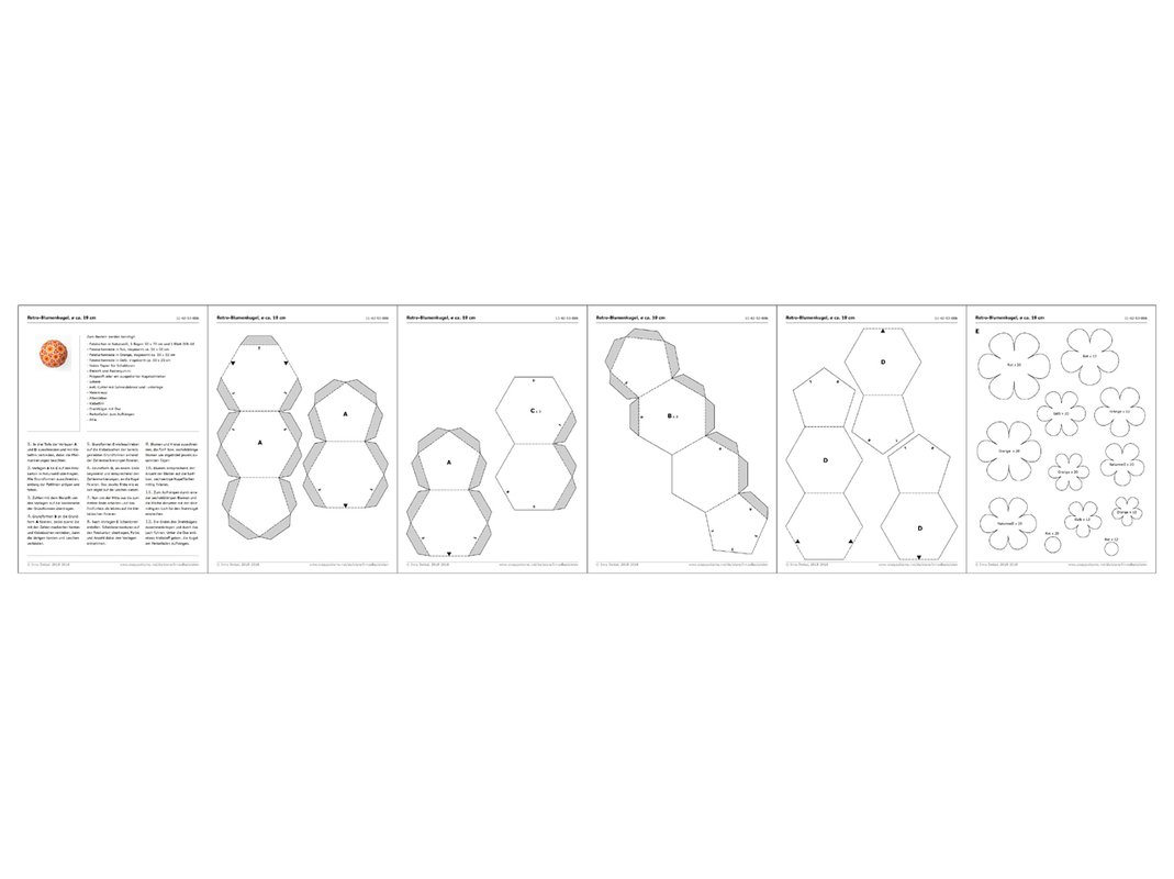 Bei so vielen Einzelteilen ist diese Blumenkugel eine perfekte Entspannungsbeschäftigung. Am Anfang, wenn du die Kugel-Elemente zusammen fügst, brauchst du noch etwas Konzentration, aber dann, bei den Blumen, gilt nur noch: ausschneiden, zusammenkleben, auf die Kugel anbringen.