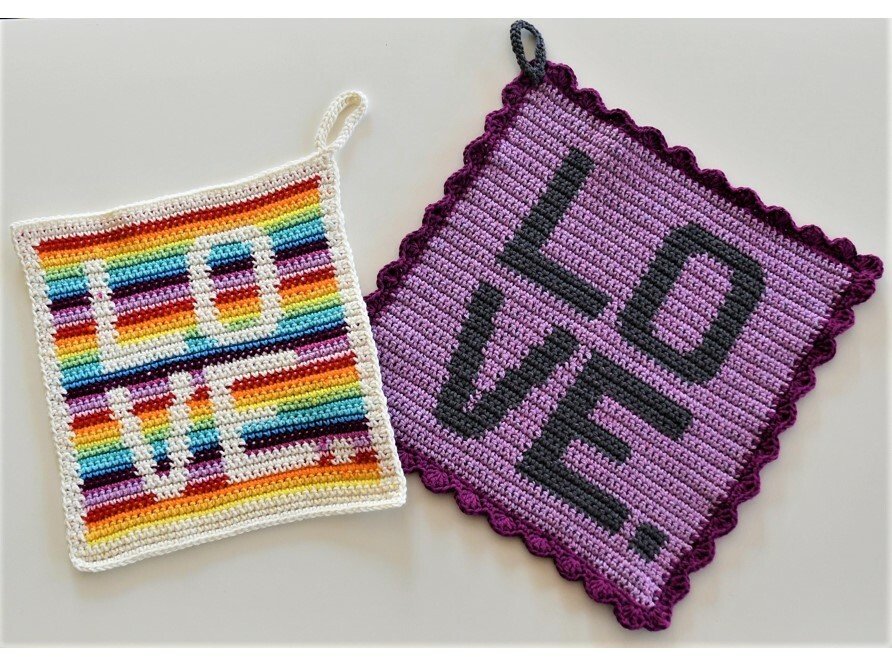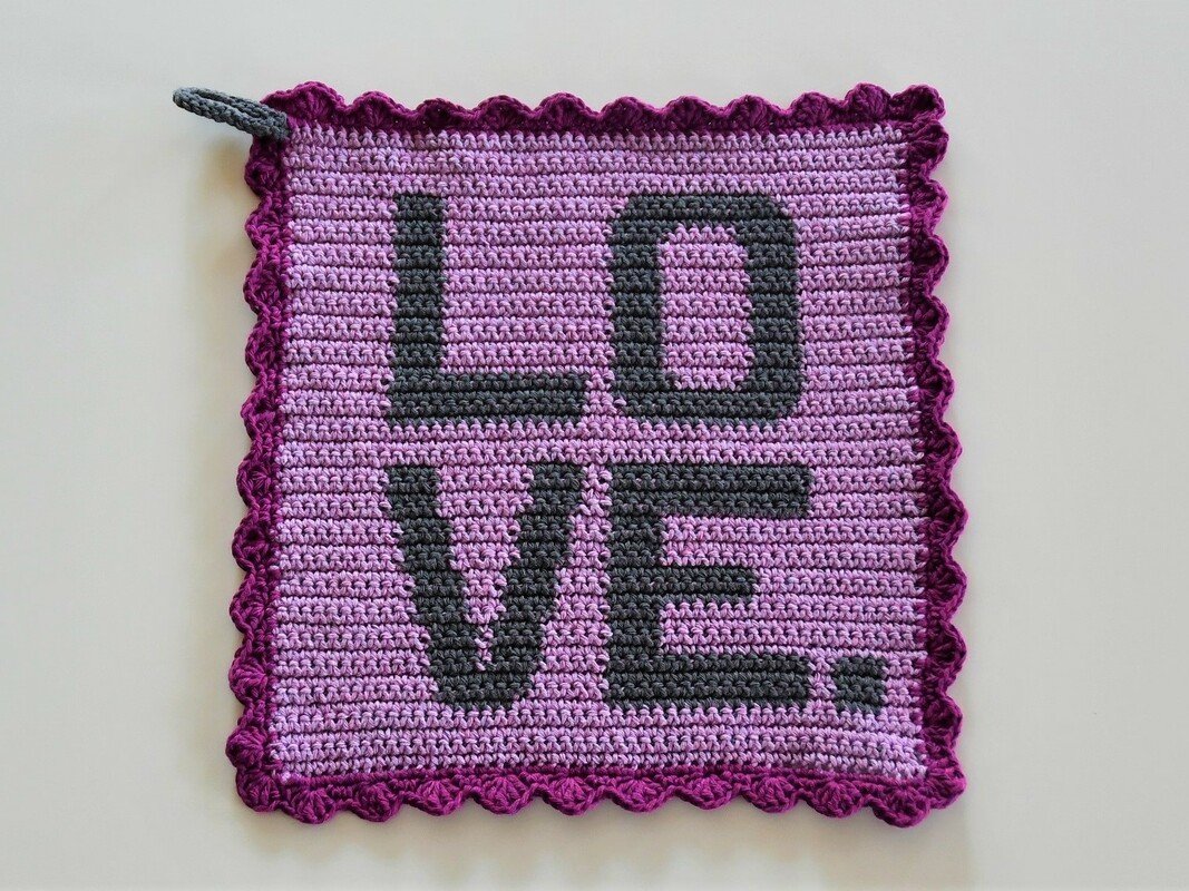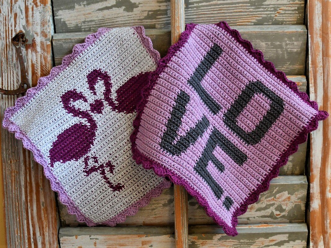 Die Topflappen werden in der Tapestry Häkeltechnik gearbeitet. Das Häkeln mit zwei Farben ist ganz einfach, macht richtig viel Spaß und wird in der Anleitung ausführlich erklärt. Da der nicht verwendete Faden jeweils eingehäkelt wird, sehen die Topflappen von beiden Seiten schön aus.