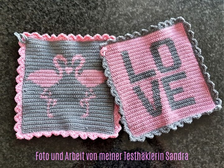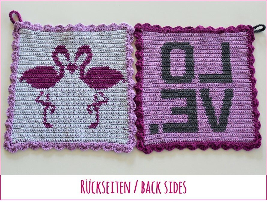 Falls Du lieber strickst, findest Du in meinem Shop eine Doubleface Strickanleitung für Topflappen mit dem Flamingo Motiv.