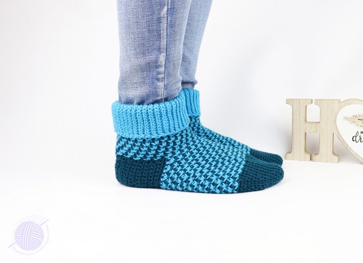 Socken: Merino Uno von Lana Grossa, 100 % Schurwolle, 50 gr./125 m., für alle Größen: 100 gr. von der Farbe Petrol und 100 gr. von der Farbe Türkis oder Farben Ihrer Wahl, Häkelnadel Nr. 4 (nur für die Ferse) und Nr. 4,5 (Nr. 5, wenn mit dem lockeren Häkeln nicht klappt).