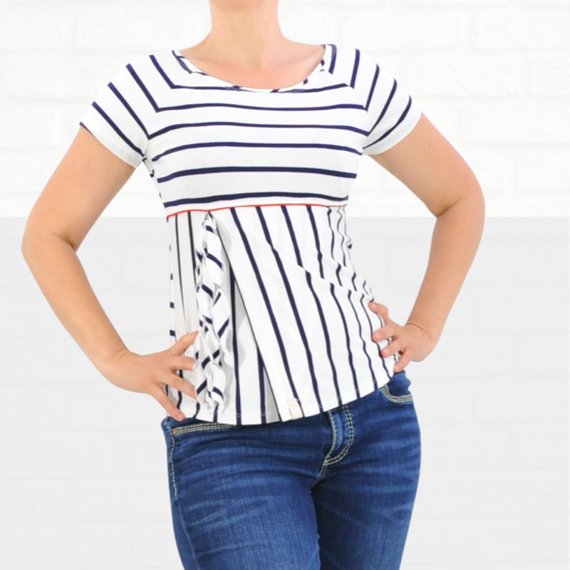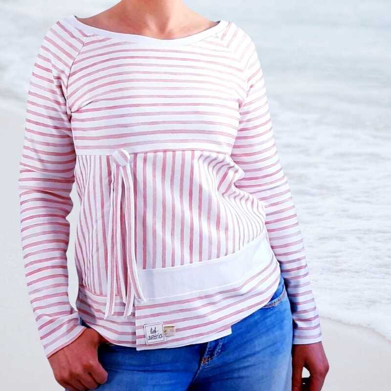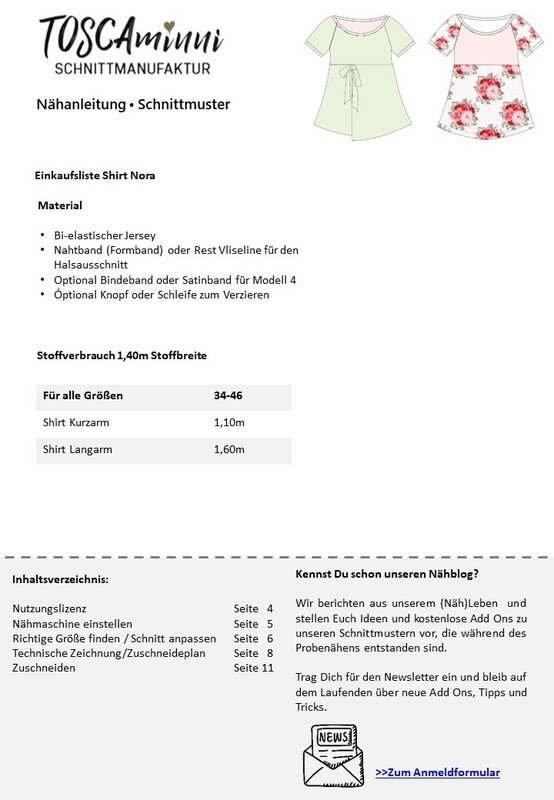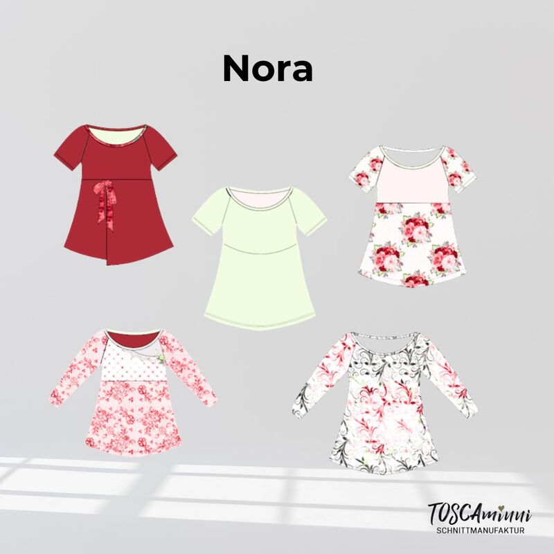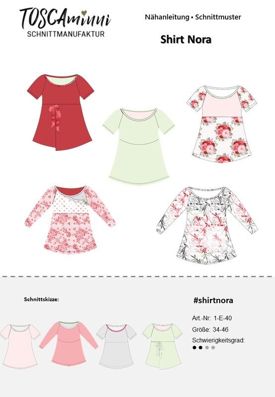 Das Schnittmuster Nora ist ein toller Basic-Schnitt, den Du immer wieder neu kombinieren kannst. Er bietet Dir 2 Passformen und Du kannst zwischein einem figurbetonten Korpus, der taillirt ist, wählen oder einem legeren Korpus der weiter geschnitten ist. Du hast 4 Vorderteile zur Auswahl – ganz klassisch oder mit 2 Passen oder einer Variante in Wickeloptik. On Top ist das Shirt „ganzjahrestauglich“, da Du kurze oder lange Ärmel dazu kombinieren kannst.