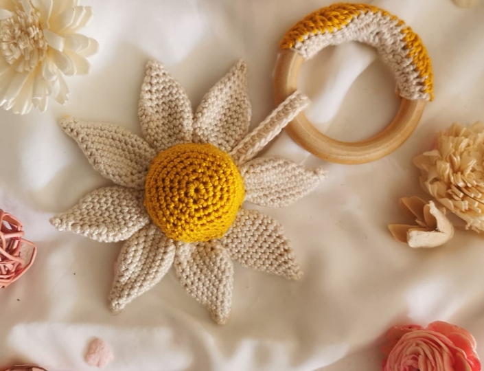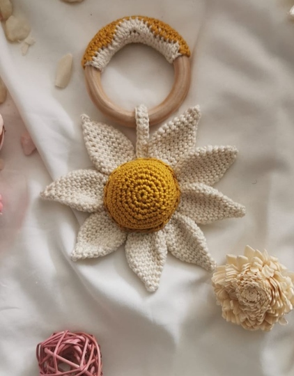 Mit Hilfe dieser Anleitung kannst du eine zauberhafte Babyrassel nacharbeiten. Die Rassel regt durch die optimale Mischung aus naturbelassenem Holz und 100 % Baumwolle Babys Sinne an. In der Babyrassel ist zusätzlich eine Rasseldose eingearbeitet. Diese süße Blume wird der Hingucker auf jeder Babyparty oder ist ein optimales Geschenk zur Geburt, zum Geburtstag oder zu zahlreichen anderen Anlässen.