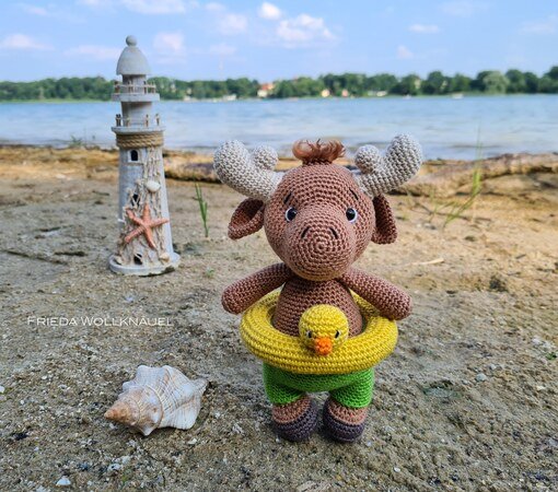 Farben: Online Garn Nr. 238 (Körper) / Nr. 81 (Hufe) / Nr. 212 (Badehose) / Nr. 42 (Geweih) / Nr. 03 (Schwimmring)