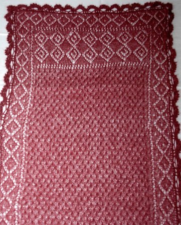 Der gestrickte Teil des Tuchs wird von einer einfachen Rautenbordüre umrahmt. Die Tuchmitte besteht aus einer unteren und oberen Bordüre und einem interessanten Sternchenmuster. Alle Lacemuster sind in Strickschriften dargestellt.