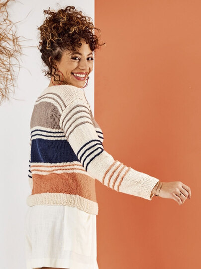 Einfach zu strickender Pulli, der durch seine verschiedenen Streifen brilliert. Das Garn macht ihr besonders edel und ist ein Stückchen Luxus.