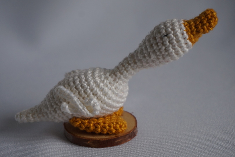 Mit den von mir aufgeführten Materialien wird die kleine Gans ca 13 cm lang und ca. 4,5 cm breit.