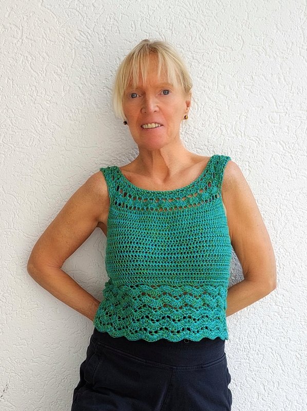Das Oberteil "Liebelei" ist ein Trägertop mit Rundpasse und einem sehr schönen Muster. Wir beginnen mit dem Muster am Halsausschnitt. Im Brustbereich häkeln wir Stäbchen. Danach geht es mit dem Muster, in etwas größerer Form, weiter. Die Länge und Brustbreite kann individuell angepasst werden. Wir starten am Halsausschnitt und häkeln das Trägertop, ohne Naht, bis zum unteren Saum. Ihr findet in der Anleitung einen ausführlichen Teil mit Text und Fotostrecken, sowie eine Häkelschrift für das Muster. Es ist NICHT notwendig die Häkelschrift lesen zu können. Bei Fragen stehe ich zeitnah zur Verfügung.