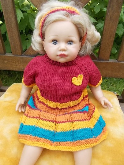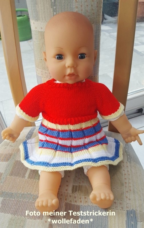 Jede Puppenmutti freut sich über neue Kleidung. Dieses hübsche bunte Kleidchen wird bestimmt Jubel auslösen. Es ist mit Raglan von oben gestrickt und fällt unten durch die Falten schön glockig.