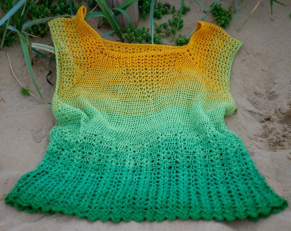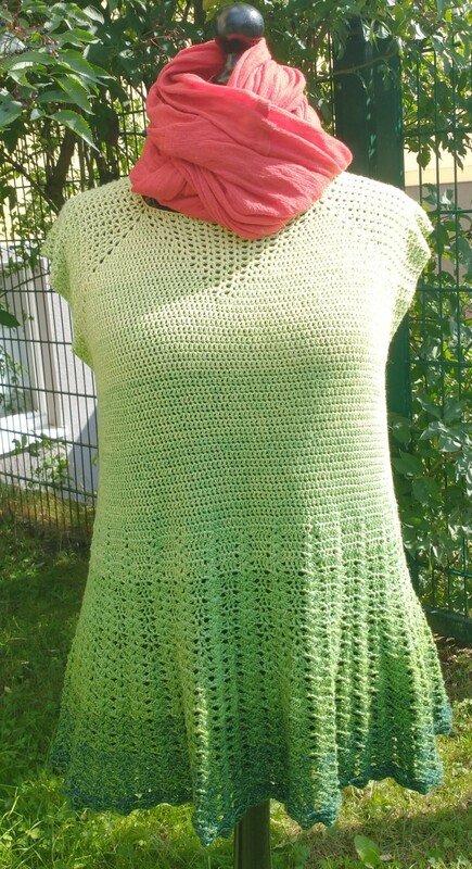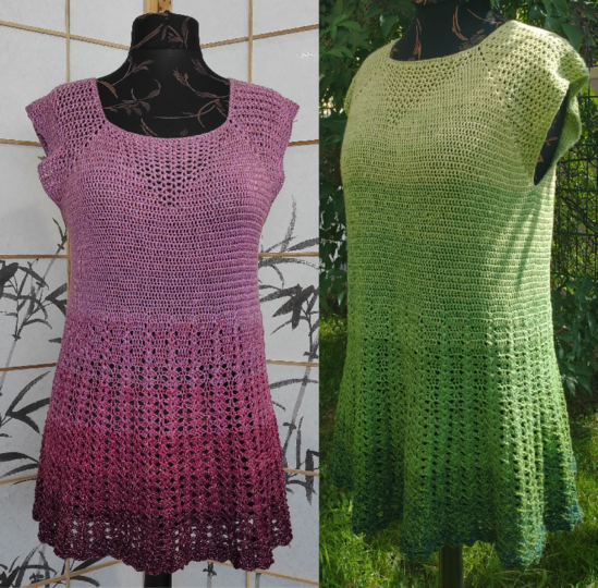 Es ist eine Häkelanleitung für eine luftige Sommertunika, die in allen Damengrößen nachgearbeitet werden kann.