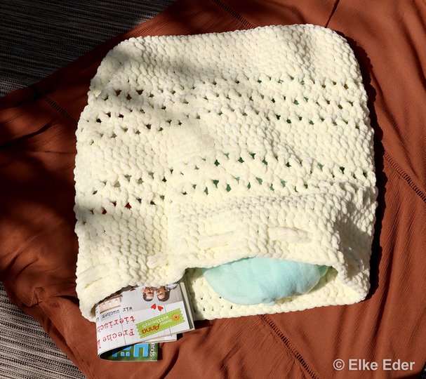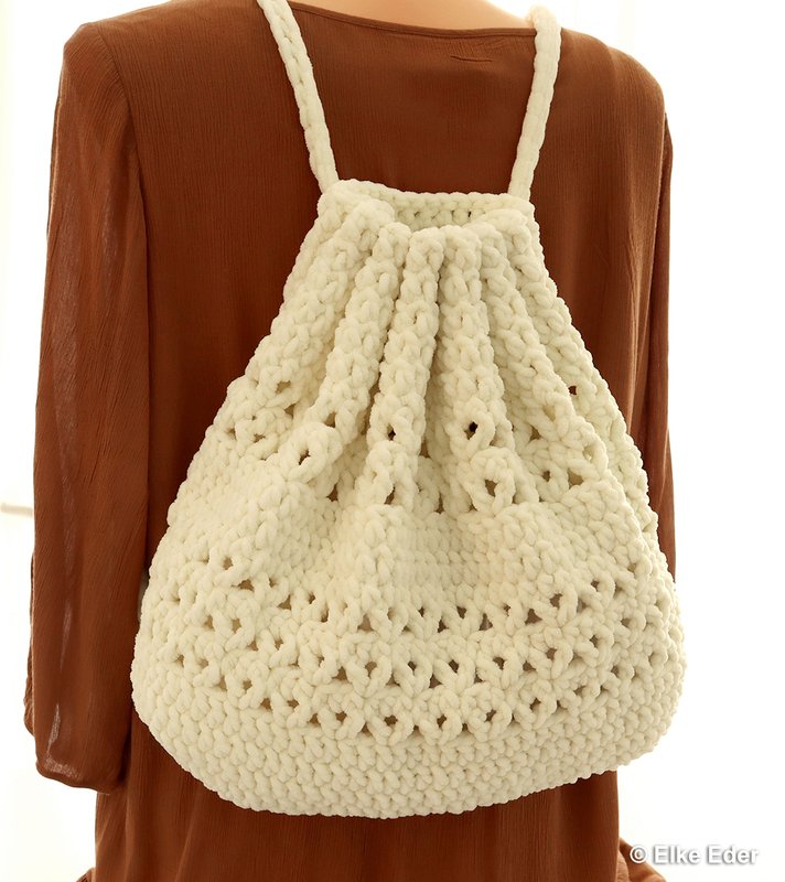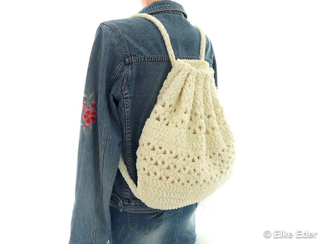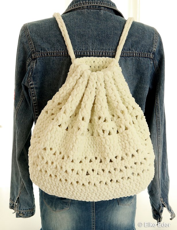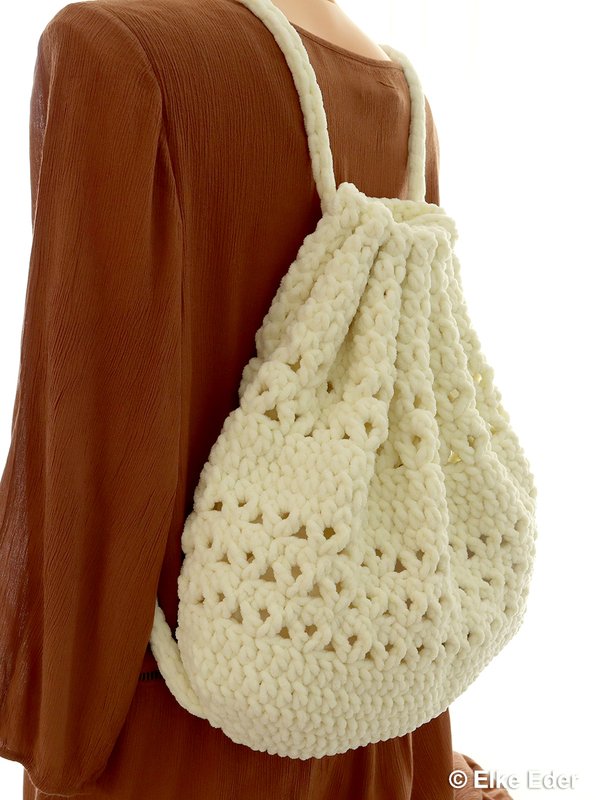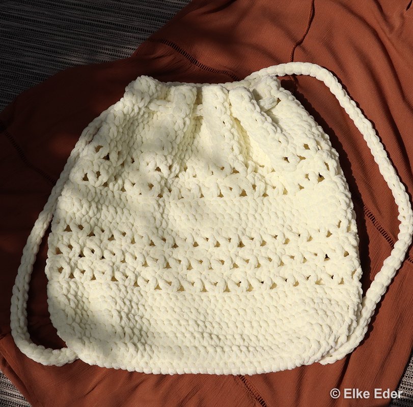 Dieser Beutel / Rucksack ist sehr schnell und einfach zu häkeln. Das Chenillegarn lässt sich wunderbar verhäkeln, ist superkuschelig weich und hat nicht viel Gewicht. Das Häkeln macht mega Spaß, der Beutel wächst ruckzuck Reihe für Reihe - eine geübte Häklerin schafft das an einem Abend.