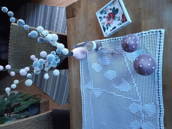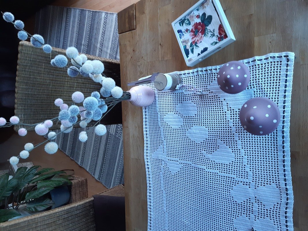Da ich den Tischläufer nicht mit Filethäkelgarn, sondern mit der Catania von Schachenmayr gehäkelt habe, passt er super auf einen längeren Tisch.