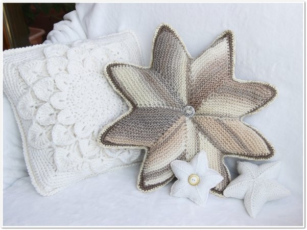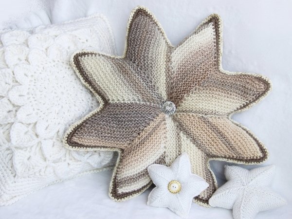 Dieser schöne gefüllte Stern ist ein Hingucker auf jeder Couch. Wenn man ihn mit einfarbigen Kissen kombiniert, kommt er besonders gut zur Geltung. Bevor der Stern zum Kissen wird, hat man zwei flache Sterne, die auch als Deckchen genutzt werden können. Der schöne Farbverlauf in Creme-Beige-Tönen, in dem auch etwas Glitzer eingearbeitet ist, kommt direkt aus dem Wollknäuel. Ihr könnt aber auch andere Garne verwenden, die Euch gefallen. Die Machart bleibt gleich. Mein Stern ist an der breitesten Stelle 47 cm.