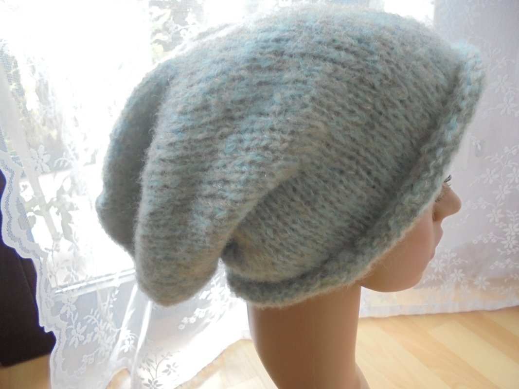 Die Höhe beträgt 34 cm. Man kann die Mütze länger oder kürzer arbeiten und den unteren Rand nach Belieben einrollen.
