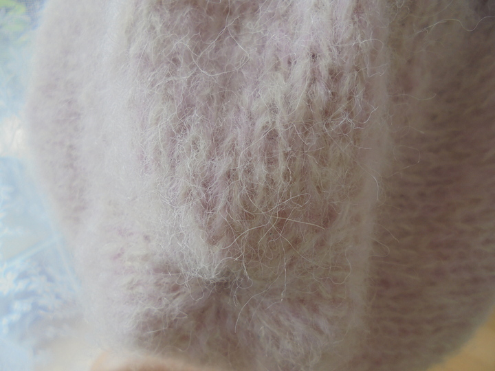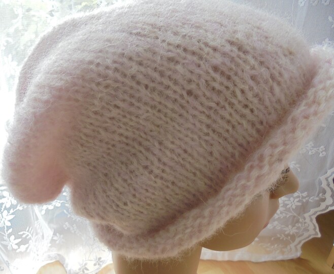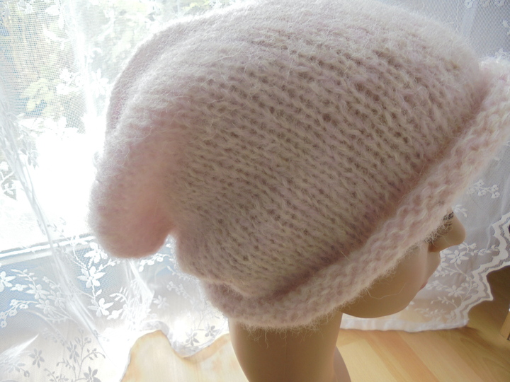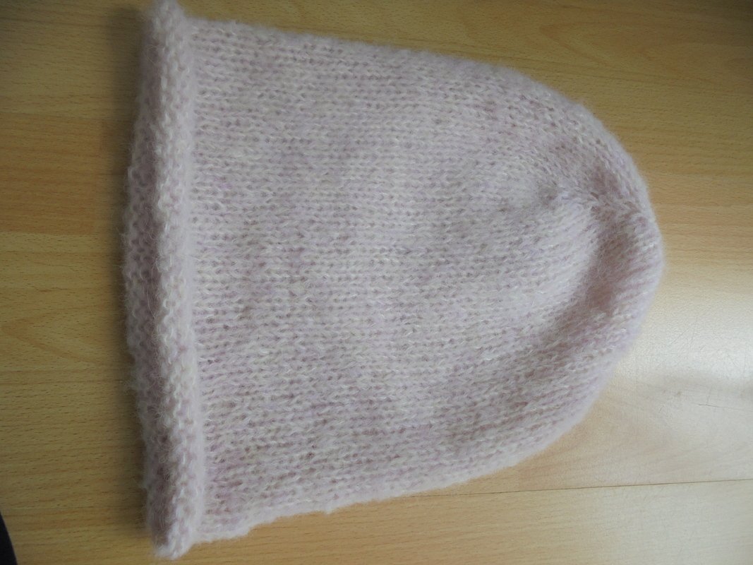Die gezeigte Mütze wurde mit einem Faden Puderrosa und einem Faden Natur gestrickt.