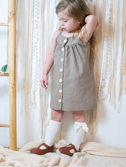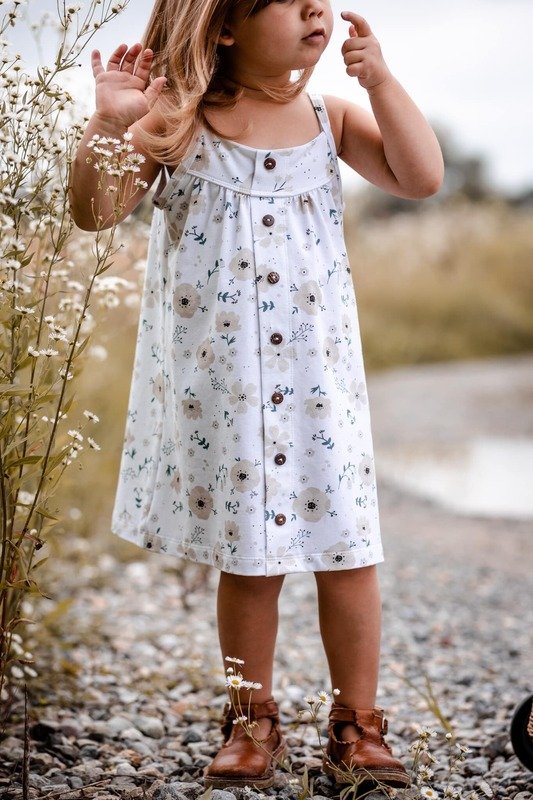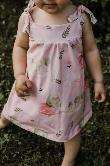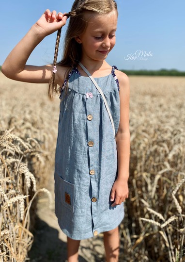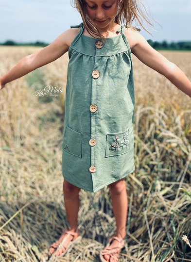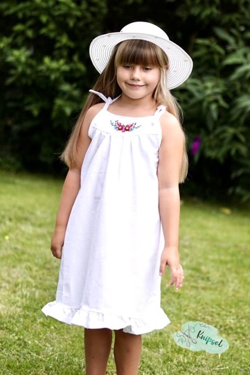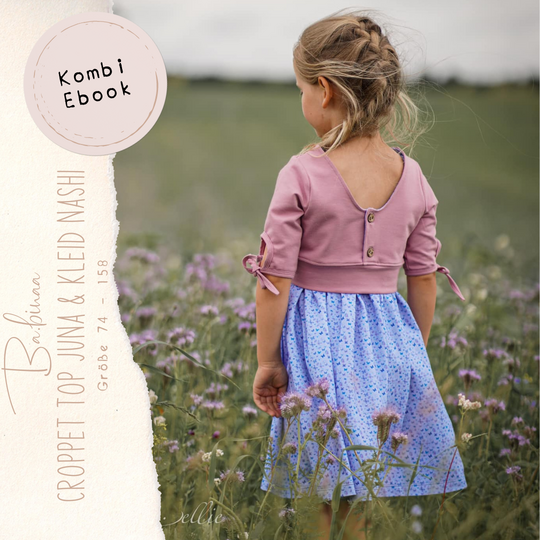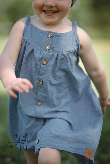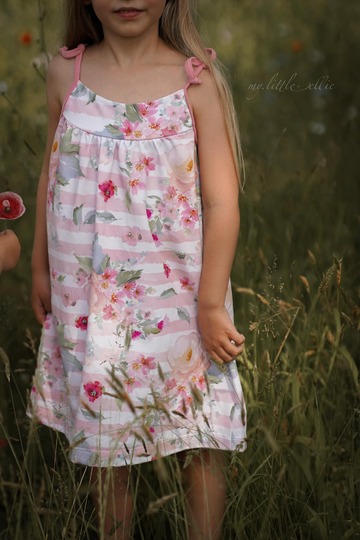 Bei diesem Schnitt handelt es sich um das Kleid Nashi. Dieses wird mit durchgängigen Spaghettiträger oder Spaghettiträgern zum Binden genäht. Optional kann am Vorderteil eine Knopfleiste genäht werden, ebenso ist optional eine Teilungsrüsche oder eine Saumrüsche enthalten. Nashi kann aus leichter Webware sowie Maschenware genäht werden.