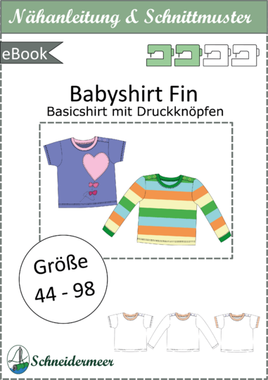 Das Modell „Fin“ ist ein Basicshirt uas Jersey für Babys, das sich leicht überziehen lässt. An der Schulter ist eine Knopfleiste aus Druckknöpfen eingearbeitet, die du wahlweise an einer oder beiden Schultern einarbeiten kannst. Beide Varianten werden ausführlich als Bild-für-Bild-Anleitung beschrieben, sodass auch Nähanfänger sich an das Shirt trauen können.