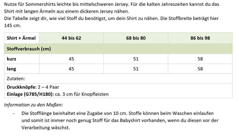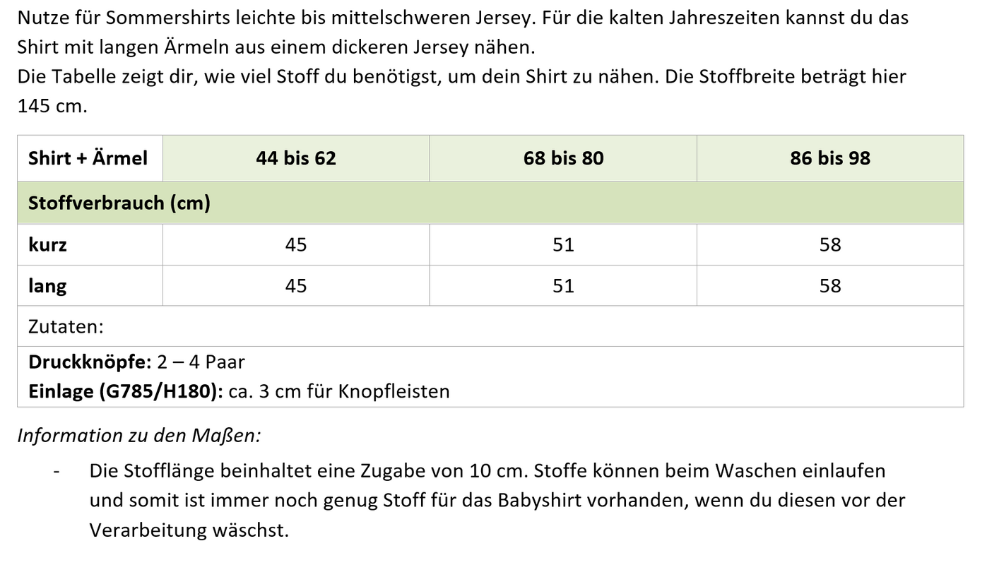 leichter bis mittelschwerer Jersey: je nach Größe zwischen 45 und 58 cm bei 145 Stoffbreite