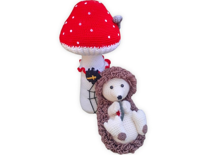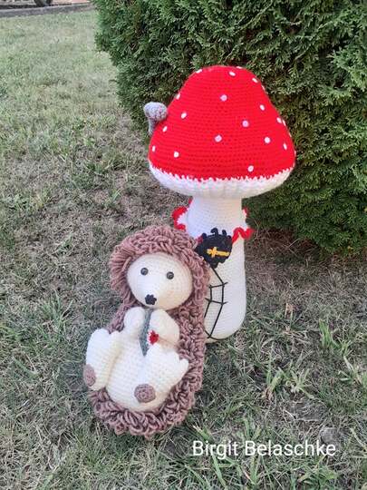 Der Pilz wird 43 cm und der Igel Igor 28 cm. Wenn mit der angegebenen Wolle nach gehäkelt wird,