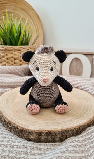 Farben: Grau (Körper, Haare) Schwarz (Arme, Beine, Ohren) Wollweiß (Kopf) Rosa (Fußsohlen, Schwanz)