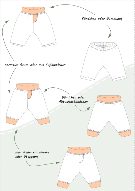 Modell 1 (Gummibund und normaler Saum) und Modell 2 (Bauch- und Fußbündchen) werden getrennt voneinander beschrieben. Das ist besonders anfängerfreundlich.