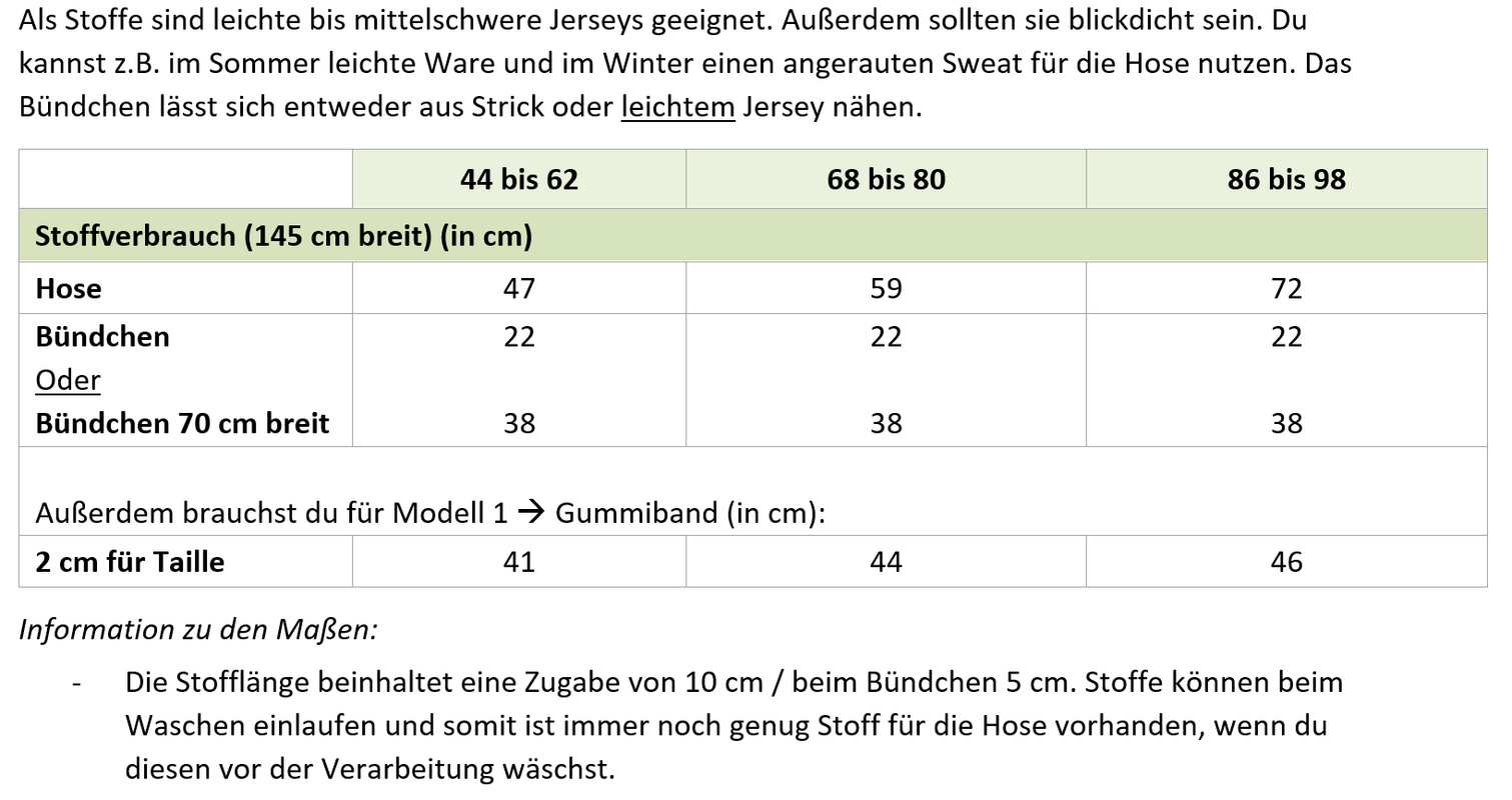 Als Stoffe sind leichte bis mittelschwere Jerseys geeignet. Außerdem sollten sie blickdicht sein. Du kannst z.B. im Sommer leichte Ware und im Winter einen angerauten Sweat für die Hose nutzen. Das Bündchen lässt sich entweder aus Strick oder leichtem Jersey nähen.