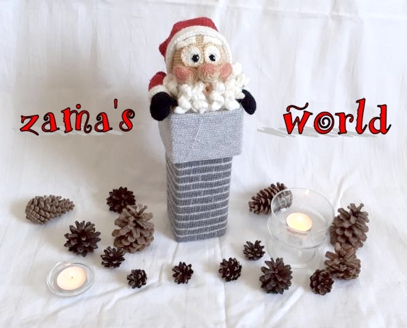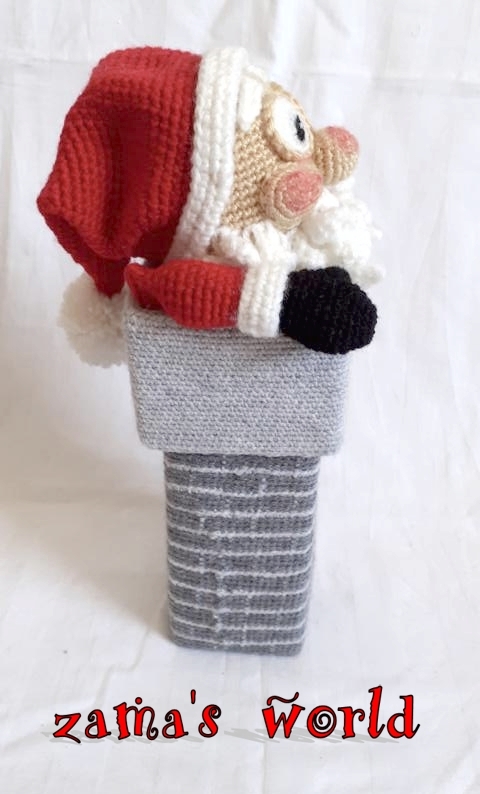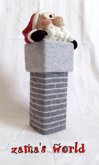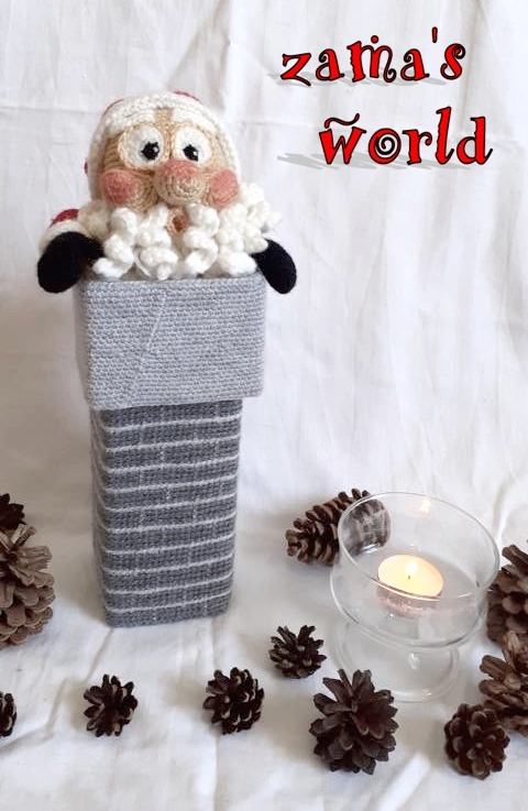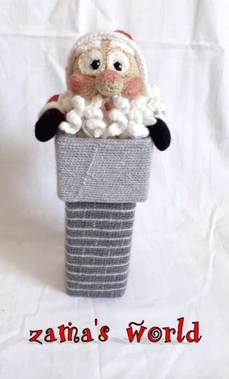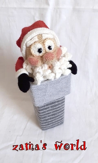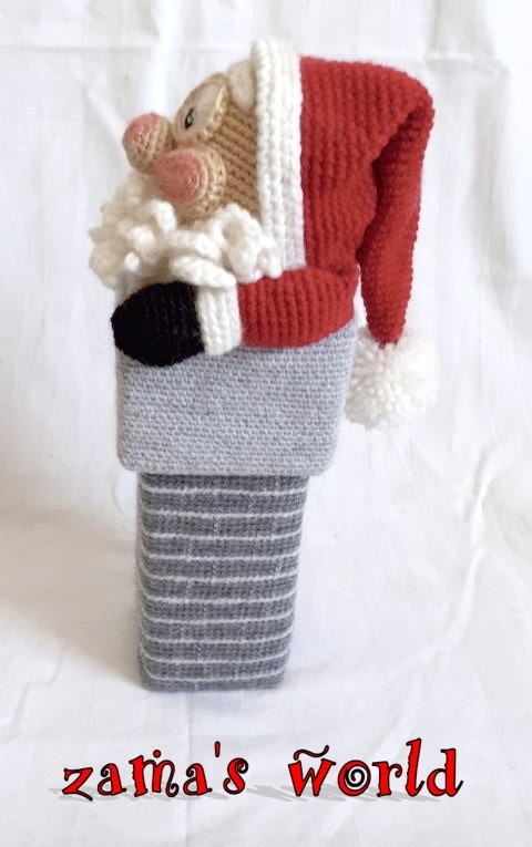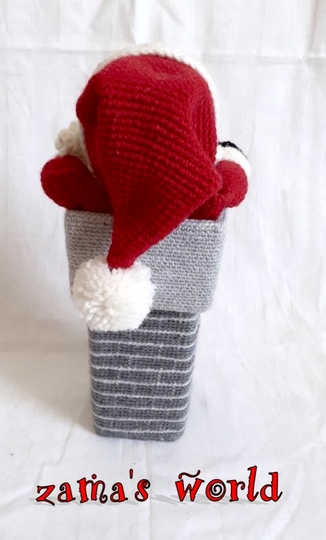 Nick im Kamin wird mit einer Häkelnadel der Stärke 1,50 gehäkelt und kommt auf eine Gesamthöhe von circa 32 cm mit einer Grundfläche von circa 8 cm x 8,5 cm.